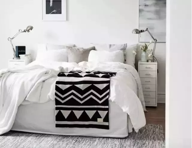 對于小戶型臥房來說,白色是非常實用的選擇,因為它可以給人一種放大的效果,使空間看起來不會顯得過于擁擠或是狹小;如果怕白色太單調,利用不同的白色建材或是軟件圖騰互相搭配,創造獨特的視覺效果,比如在床頭的上方,簡單的掛幅藝術畫或者擺個金屬床頭燈。