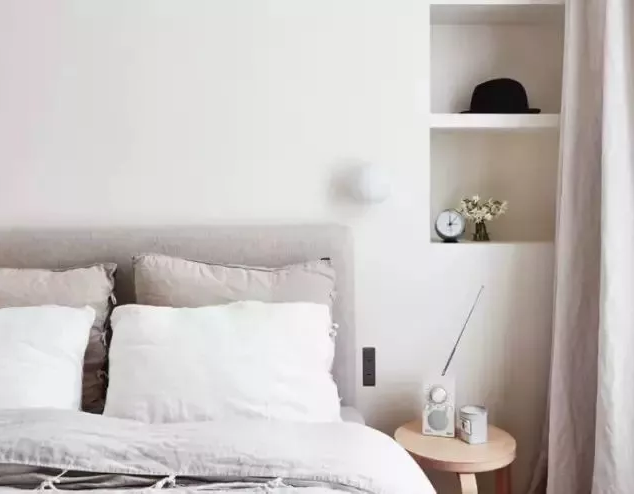 比較新的建筑物,通常石膏板都會選擇空心的,如果你的床所靠的墻非外墻時,可以考慮在墻面上切出壁龕,壁龕不需要很深,只需要放置鬧鐘或是生活小物品的寬度即可。
